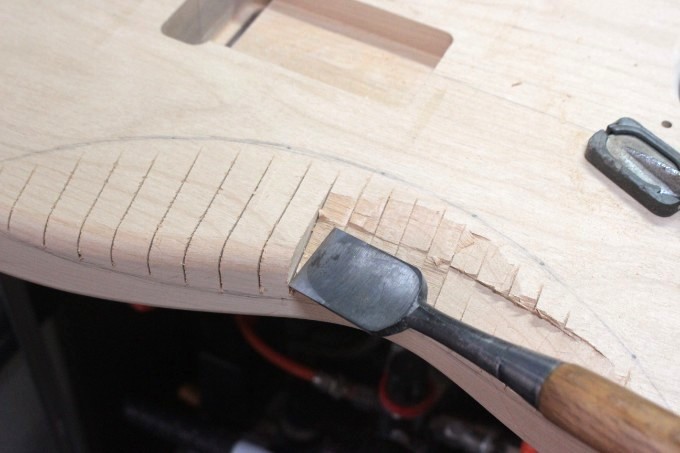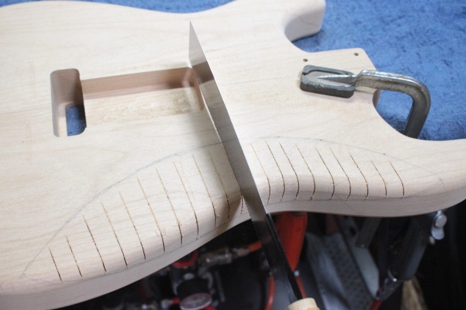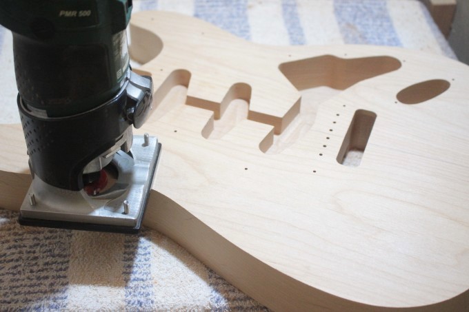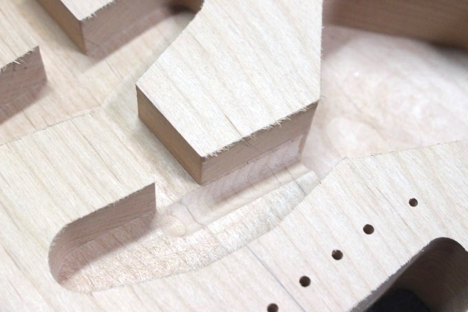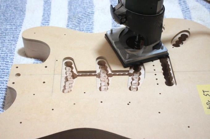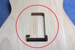リアピックアップザグリはヴィンテージスタイルではよく見られるおなじみの配線溝加工をしています(トリマーの丸溝ビット使用)。