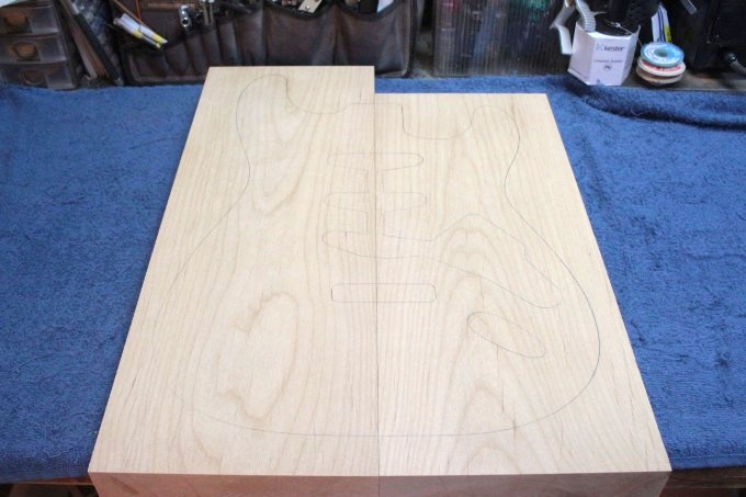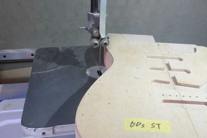 早速ボディ用テンプレートに沿って外周をバンドソーで大まかにカット↓