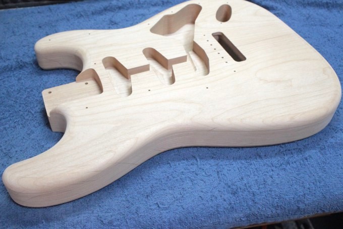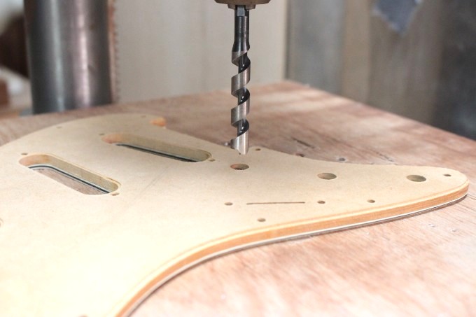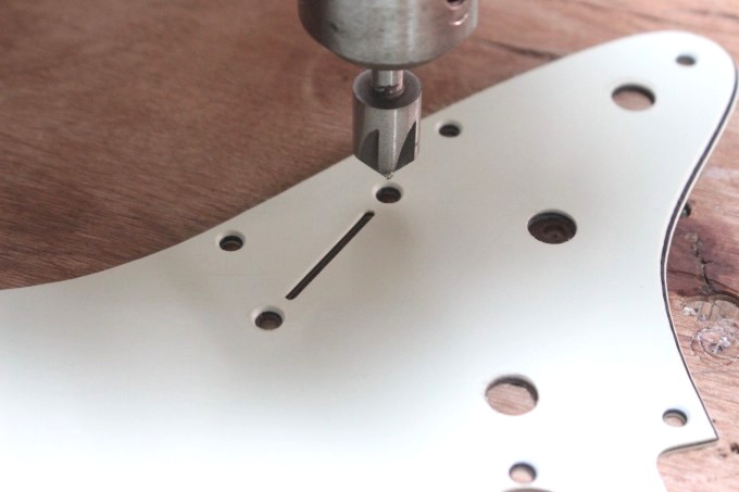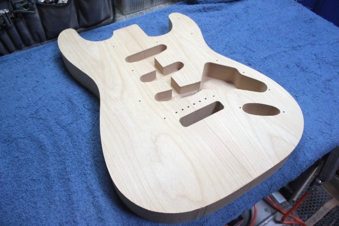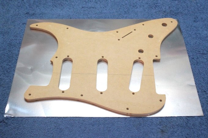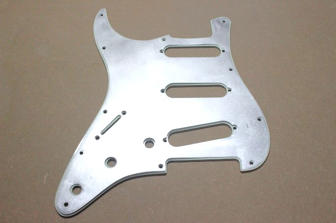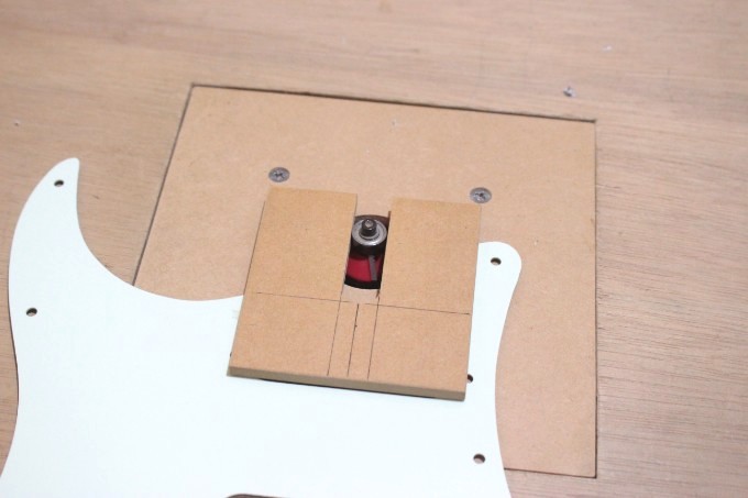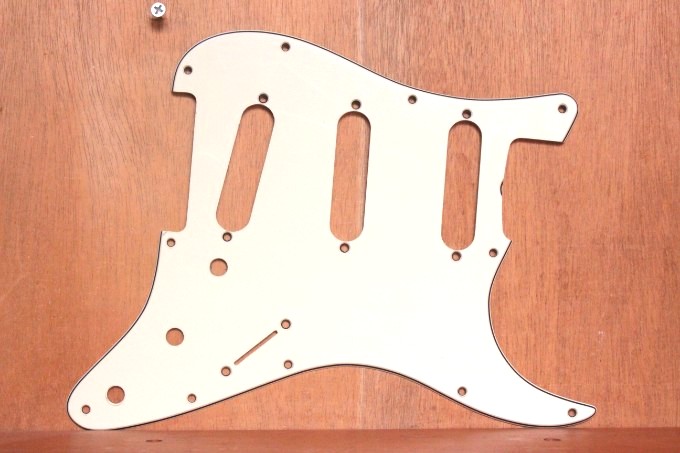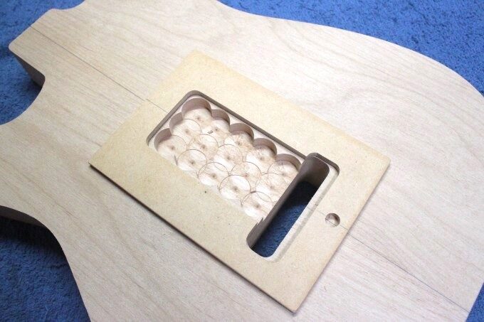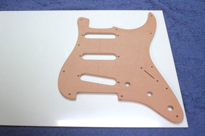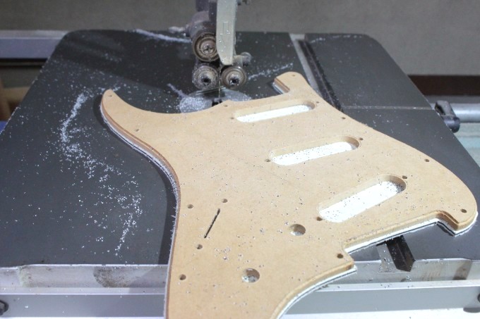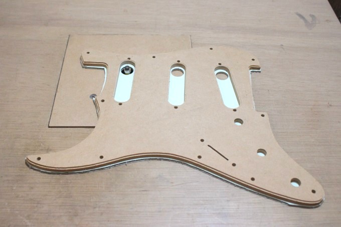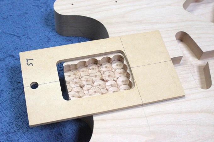 ※ピックガードの製作過程と概ね同じなので工程は割愛。ただしピックガード側よりも外周は少し小さく、逆にピックアップ部や各穴の部分は少し大きく加工します(干渉、はみ出し防止の為)。また表面はランダムサンダーで軽く削る事でそれっぽくしています。