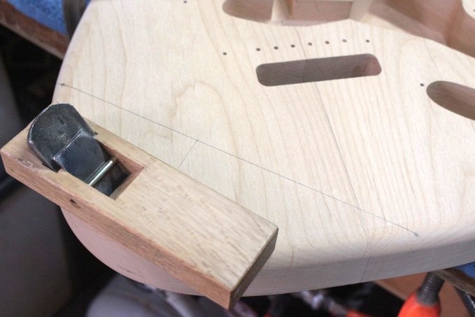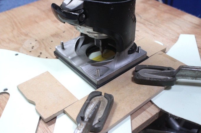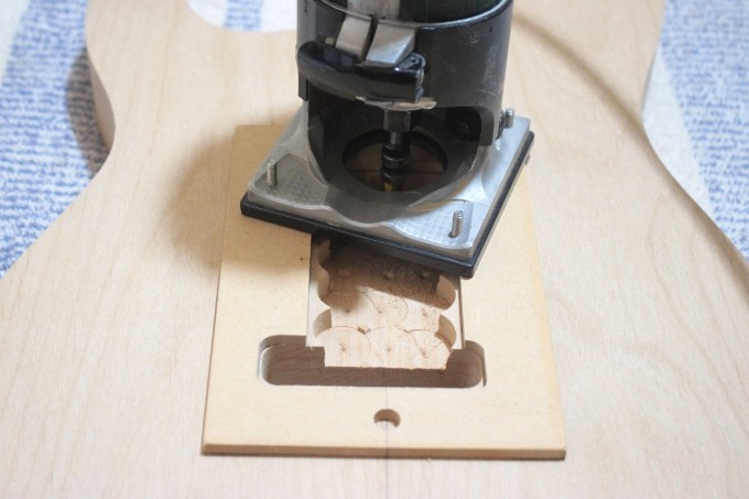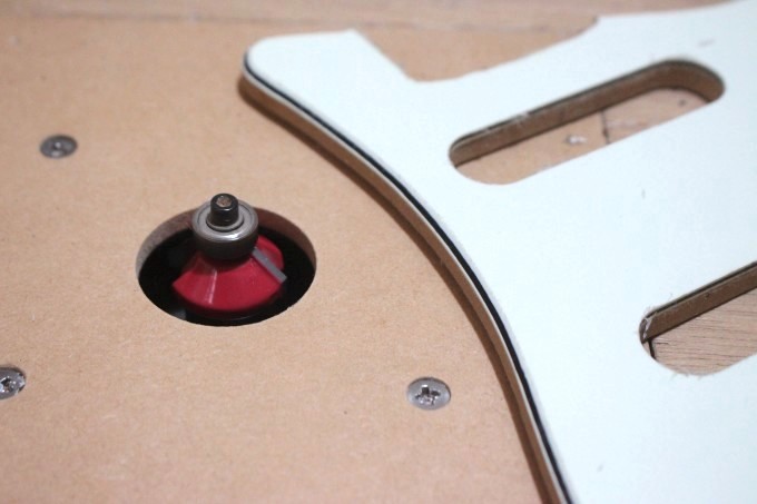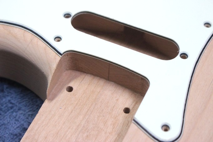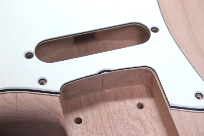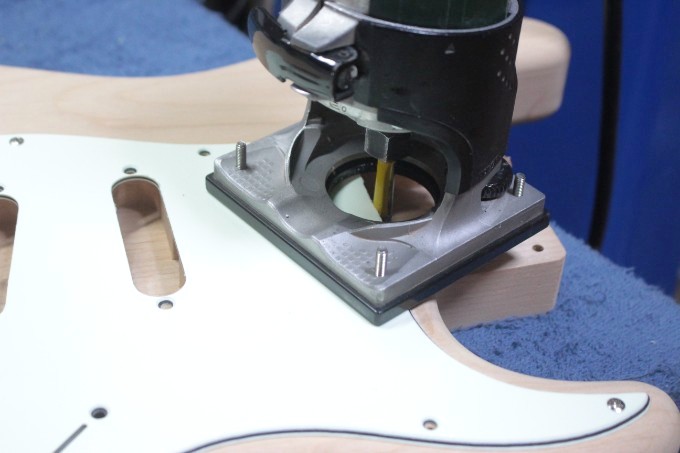 ピックガードをボディに仮止めしボディ側のネックポケット部に対してピッタリになるようトリマー(コロ付きビット)で加工。