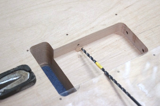 前回のような凡ミスが2度とないよう位置関係をよく確認してからテンプレートを配置しトリマーで仕上げます(ボール盤で荒加工をしてから)。