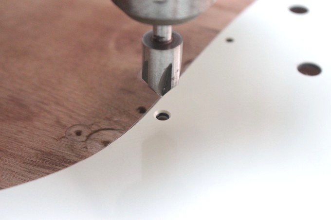 外周が整ったらボディ用テンプレートの各穴(パーツ取付穴)に沿ってボール盤で穴あけ、ザグリ部はフォスナービットで荒加工をしておきます↓
